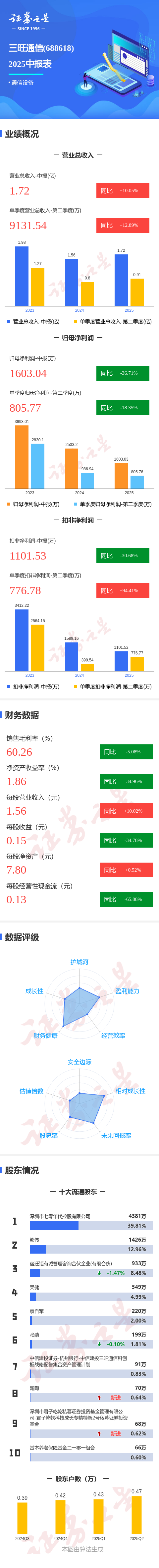 证券之星消息,三旺通信2025年中报显示,公司主营收入1.72亿元,同比上升10.05%;归母净利润1603.04万元,同比下降36.72%;扣非净利润1101.53万元,同比下降30.69%;其中2025年第二季度,公司单季度主营收入9131.54万元,同比上升12.89%;单季度归母净利润805.77万元,同比下降18.36%;单季度扣非净利润776.78万元,同比上升94.41%;负债率20.08%,投资收益18.5万元,财务费用77.58万元,毛利率60.26%。